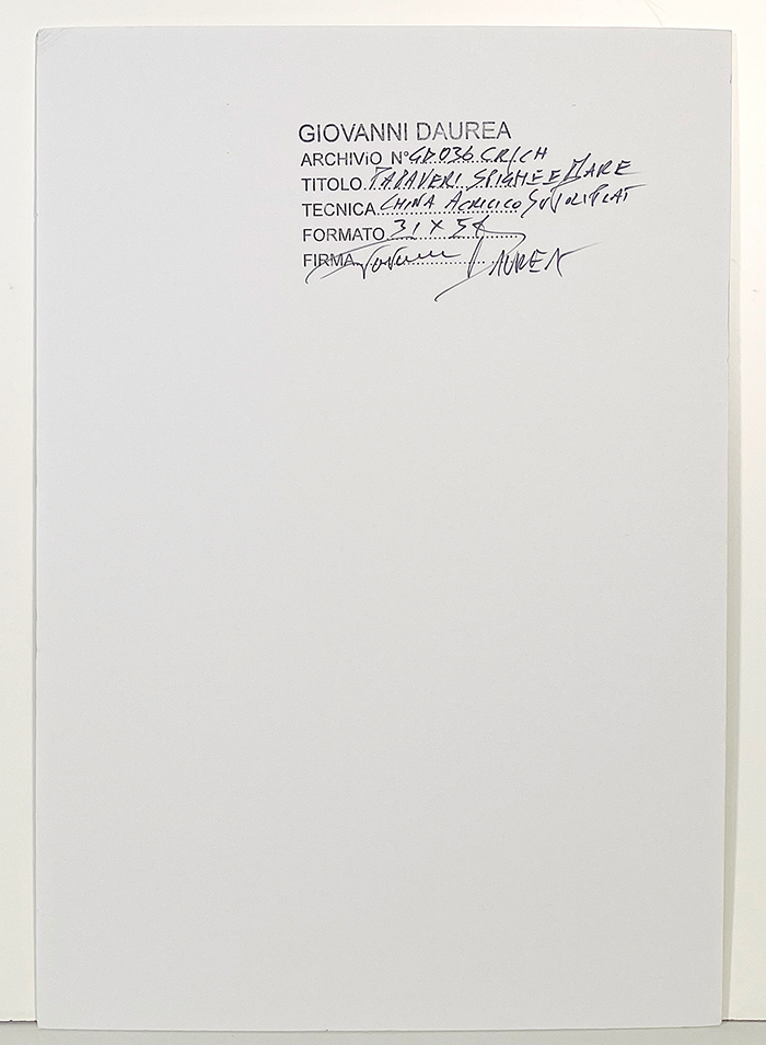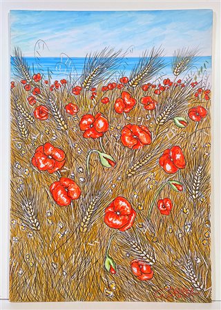 DAUREA GIOVANNI "Papaveri Spighe e mare" china acrilico su poliplat Opera archiviata GD036CR/CH Titolo, firma numero di archiviazione e dimensione a retro, 31x51 cm