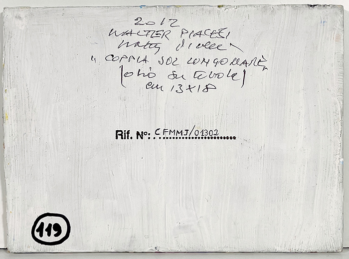 PIACESI WALTER "Coppia sul lungomare" olio su tavola, anno 2012, opera archiviata presso l'archivio Walter Piacesi rif. CFMMJ/01302. firma e numero di archiviazione a retro dell'opera, cm 13x18