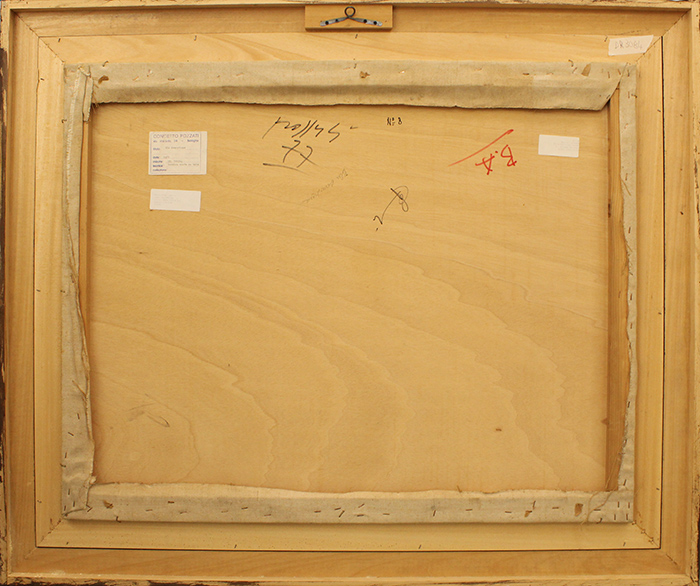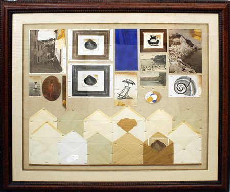 CONCETTO POZZATI, "Blu domestique", 1977, tecnica mista su tela, cm 80x100, con cornice 104x124x7, peso 10 kg, Opera con certificato di provenienza della Tornabuoni Arte Firenze. Opera con certificato della Daliano Ribani Arte. Al verso: firma e anno al centro in alto, in alto a sinistra etichetta con informazioni. Opera con cornice in omaggio.