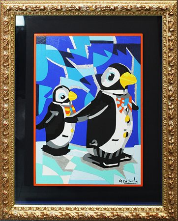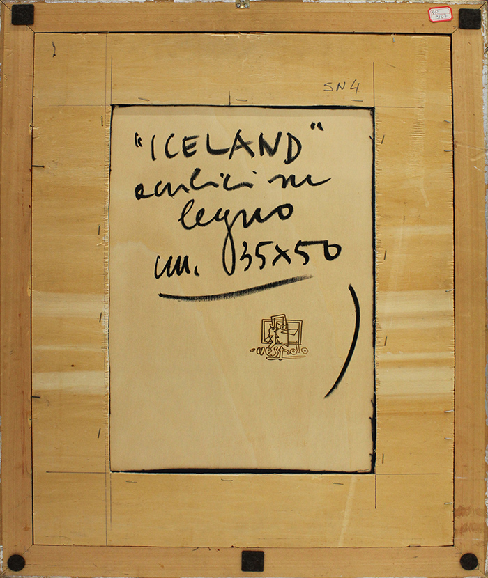 UGO NESPOLO, "Iceland", anni 2000, acrilico e intarsio su tavola, 50x35 cm, cm con cornice 72x57x5, peso 5 kg, Opera con Archivio dello Studio Nespolo. Al fronte firma in basso a destra. Al verso: titolo, tecnica, misure, timbro dell'Archivio Nespolo. Opera pubblicata sul Catalogo "L'arte dell'insofferenza", Daliano Ribani Arte a cura di Lisa Parra. Opera con cornice.