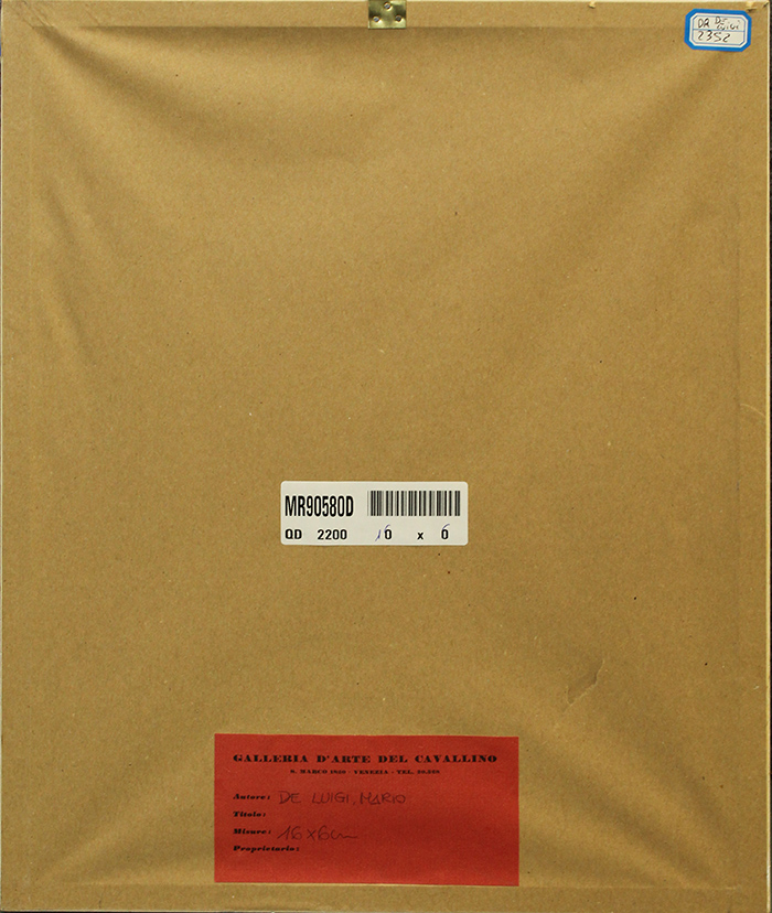 MARIO DELUIGI, anni '70, tecnica mista su cartoncino, cm 16x6, con cornice 43x33x2, peso 1 kg. Al fronte: firma in alto. Al verso: etichetta Galleria D'Arte del Cavallino Venezia con nome artista e dimensioni. Opera con cornice.