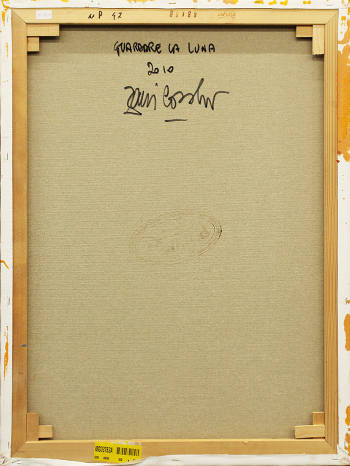 CORRADO ZANI, "Guardare la luna", 2010, tecnica mista su tela, dim 80x60. Al fronte: firma in basso al centro. Al verso: titolo, anno, firma, timbro in alto al centro.