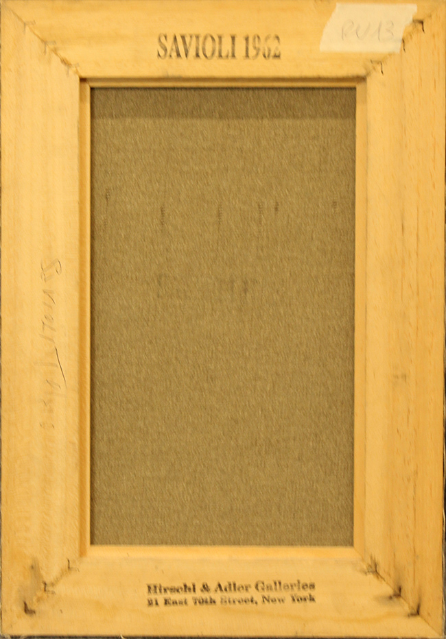 TELZIO SAVIOLI, "Ritratto", 1962, tecnica mista su tela, 41x28x1 cm, 1 kg. Al fronte: firma in basso a destra. Al verso: firma sul telaio a sinistra, timbro firma e anno in alto sul telaio. Opera con certificato di provenienza della Daliano Ribani Arte. Opera senza cornice.