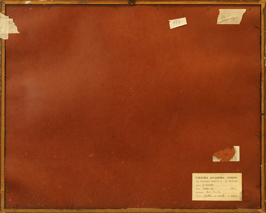 GIANBAR, "Fabbriche", 1972, pastello su carta, cm 25x35, con cornice 42,5x52,5x1, 1 kg. Al fronte: firma in basso al centro. Al verso: in basso a destra etichetta della Galleria Accademia di Torino. Opera con certificato di provenienza della Daliano Ribani Arte. Opera con cornice in omaggio.
