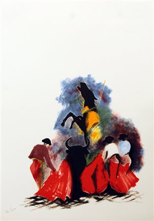 JOSE' GUEVARA, Corrida e cavallo, anni '90, litografia su cartoncino, 70x50 cm. Al fronte: tiratura in basso a sinistra, esemplare 70/150, firma in basso a destra. Opera senza cornice.