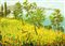 MICHELE CASCELLA, "Casa in collina", anno 1983, serigrafia e litografia a 30 passaggi di colore, tiratura a 300 esemplari in numeri arabi +C numeri romani e alcune prove d'autore, esemplare 182/300. . Il colore della tiratura al retro traspare leggermente sul fronte. Opera con certificato di provenienza della Daliano Ribani Arte. Opera senza cornice.