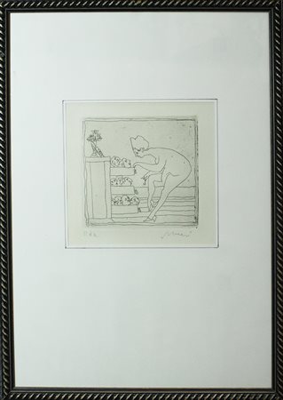 MINO MACCARI, "Femme Fatale", anni '80, incisione su cartoncino, misura incisione cm 20x21, misura del foglio 50x36, misura con cornice 54x39x2, peso 2 kg, esemplare PDA. Al fronte: tiratura in basso a sinistra e firma in basso a destra. Opera con cornice. Presenta quasi impercettibile fioritura.