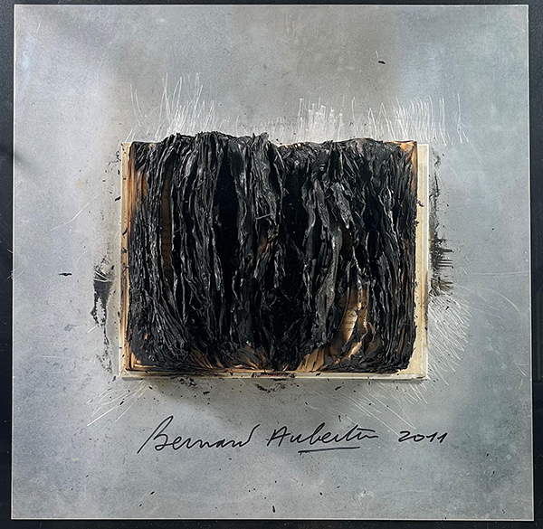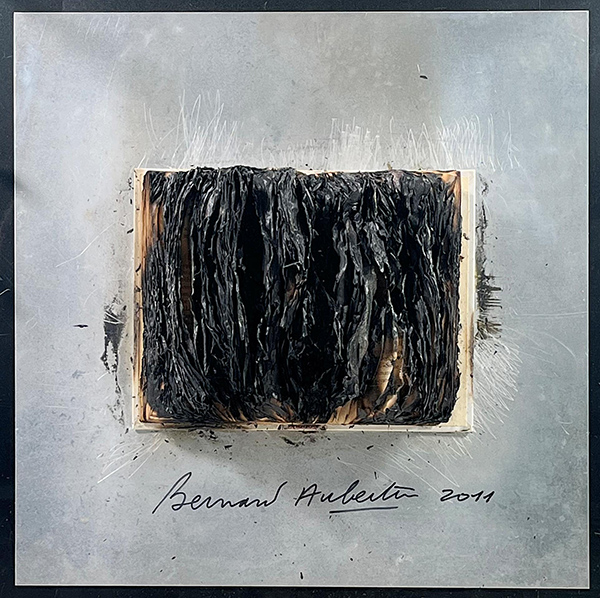 AUBERTIN BERNARD, Libro bruciato su lastra di alluminio, anno 2011, pubblicato sul catalogo della mostra Bernard Aubertin "Oeuvres Récentes" a pagina 115 - archiviata nell' Archivio Generale opere Bernard Aubertin Galleria d'arte Rosenberg. Archivio Generale opere Bernard Aubertin su fotohgrafia, 40x40 cm