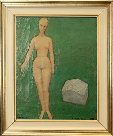 GUIDO CADORIN, "Alomas", 1958, olio su tela, 50x40 cm, con cornice 64x54x5,5 cm, peso 2,70 kg. Al fronte: firma in basso a sinistra e anno, titolo in basso a destra. L'opera presenta crackler, non è in perfette condizioni. Opera con certificato di provenienza della Daliano Ribani Arte. Opera con cornice in omaggio.