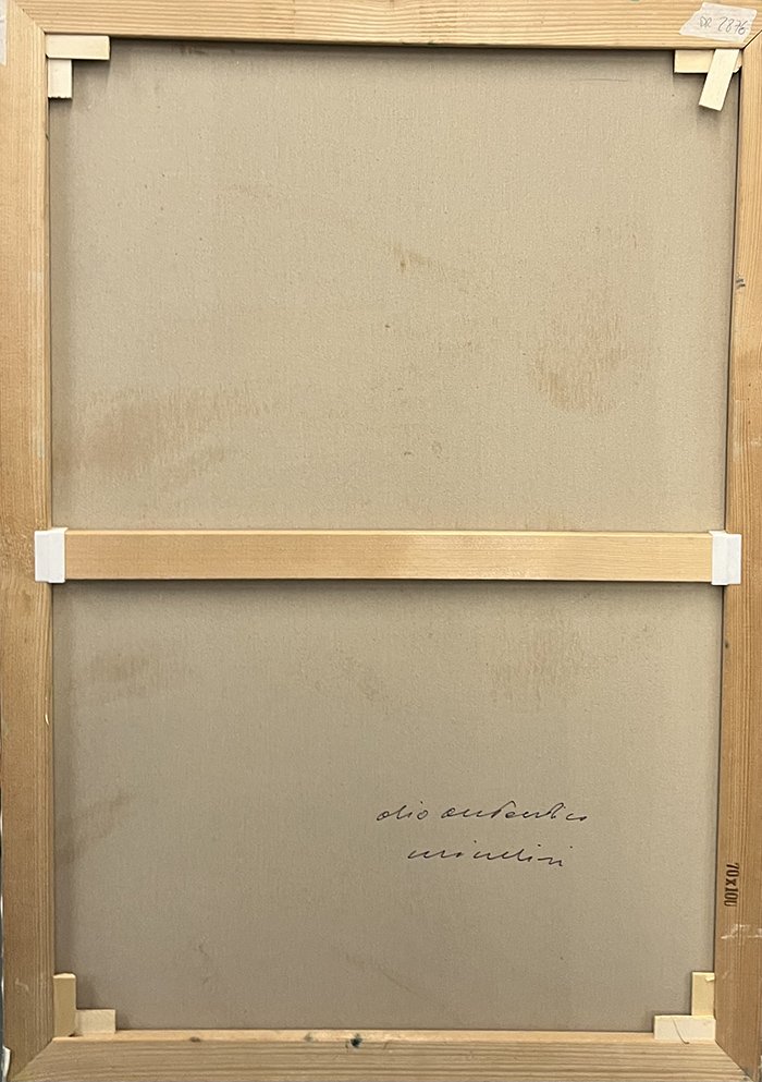 REMO BRINDISI, "Figura", anni '90, olio su tela, dim. 100x70x1 cm, peso 1 kg, autentica su foto dell'artista, opera con certificato di provenienza della Galleria Pace al numero A1616. Al fronte: firma in basso a destra. Al verso: dichiarazione di autenticità da parte dell'artista in basso. Opera con certificato di provenienza della Daliano Ribani Arte. Opera senza cornice.