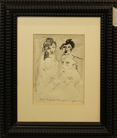 MINO MACCARI, "Decidi! O inganni tua moglie o inganni il fisco!", anni 50, tecnica mista e acquarello su cartoncino, 28x21 cm, con cornice 56x47x3 cm, peso 3 kg, opera archiviata dalle opere del Maestro Mino Maccari a cura di Marco, Giuseppe e Bruna Maccari al N°1633. Al fronte: firma in basso a sinistar e titolo in basso al centro. Al verso: etichetta in basso di Art Shop Gallery con informazioni. Opera con cornice in omaggio.