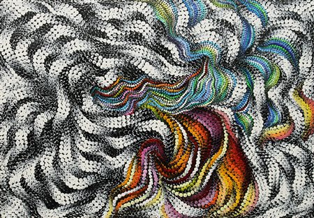 RITA MAZZINI, "Entropia", 2020, Ferrara, acrilico su tela dipinto a mano libera, dim 70x50x4. Al verso: nel centro in alto nome artista e anno, sotto firma, a destra titolo, tecnica, misure e luogo.