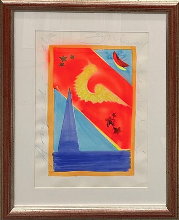 BRUNO CECCOBELLI, anni 2000, tecnica mista su cartoncino, cm 44,5x30,5, con cornice 64x50x3, kg 2. Al fronte: "Angeli di Bruno Ceccobelli". Opera accompagnata da autentica su foto dell'artista. Opera con cornice