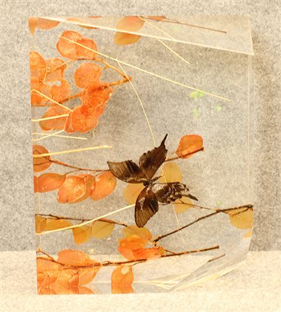 LORENZO VISCIDI BLUER, "Mystic flight", anni 2000, piante e farfalle inglobate in plexiglass, cm 38x29x7,5, kg 8,75. L'opera non necessita cornice