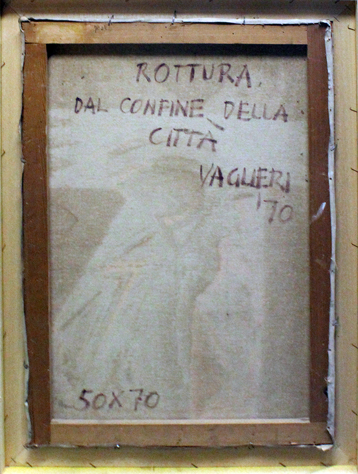 TINO VAGLIERI, "Rottura dal confine della città", anni 70, olio su tela, cm 70x50 con cornice 94x74x5 kg 8. Al fronte: firma in basso a sinistra. Al verso: titolo, firma, anni, misura. Certificato di provenienza della Daliano Ribani Arte. Opera con cornice in omaggio.