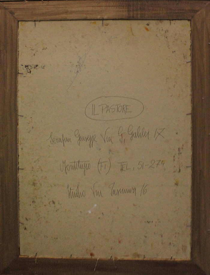 GIUSEPPE SERAFINI, "Il pastore", anni 70, olio inciso su tavola, cm 70x50 con cornice 100x80x3 kg 5 Al fronte: firma in basso a destra. Al verso: titolo, firma, luogo di esecuzione, Montelupo, Firenze. Certificato di provenienza della Daliano Ribani Arte. Opera con cornice in omaggio.