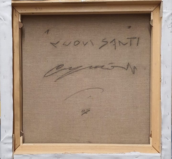 OMAR GALLIANI " Nuovi santi", 2007, tecnica mista su tela, cm 60x60. Al verso: titolo, anno e firma. Opera senza cornice. Opera accompagnata da certificato di provenienza