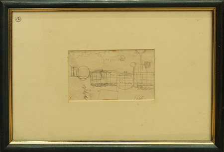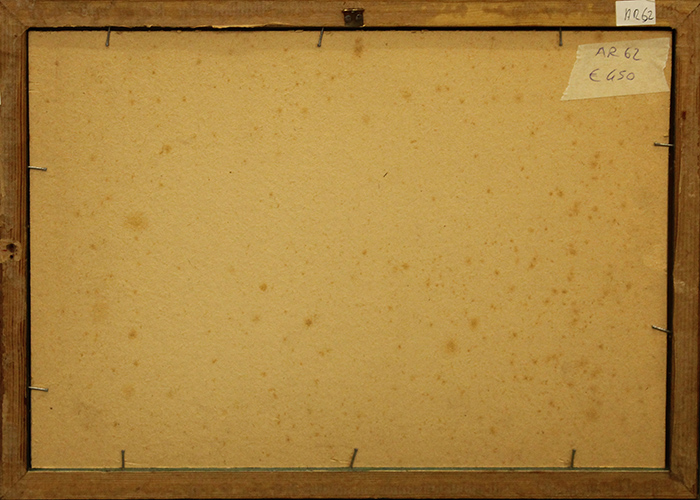 BRUNO SAETTI, anni 50, disegno su cartoncino, cm 10x16 xon cornice in omaggio 29x39x2 kg 1. Al fronte: firma in basso a destra. L'opera presenta una leggerissima fioritura. Certificato di provenienza della Daliano Ribani Arte. Opera con cornice in omaggio.