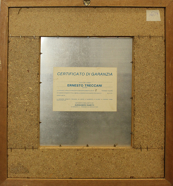 ERNESTO TRECCANI, "Ritratto " anni 80' , la presente opera è riprodotta serigraficamente con 8 passaggi di colore su lamia d'argento titolo 999 nella misura di cm 24x30 con cornice in omaggio 52x45x4,5 kg 4 con tiratura 93\100. Al fronte: tiratura e timbro in basso a sinistra timbro a destra, sul retro etichetta esplicativa. Certificato di provenienza della Daliano Ribani Arte. Opera con cornice in omaggio.