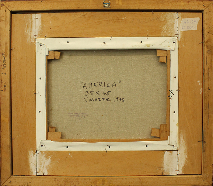GASTONE ORELLANA "America " 1976, tecnica mista su tela , cm 35x45 con cornice 60x69x4 kg 5. Al fronte:firma e anno in alto a sinistra. Al verso : titolo, misure, luogo di esecuzione, anno , e timbro. Certificato di provenienza della Daliano Ribani Arte. Opera con cornice in omaggio.