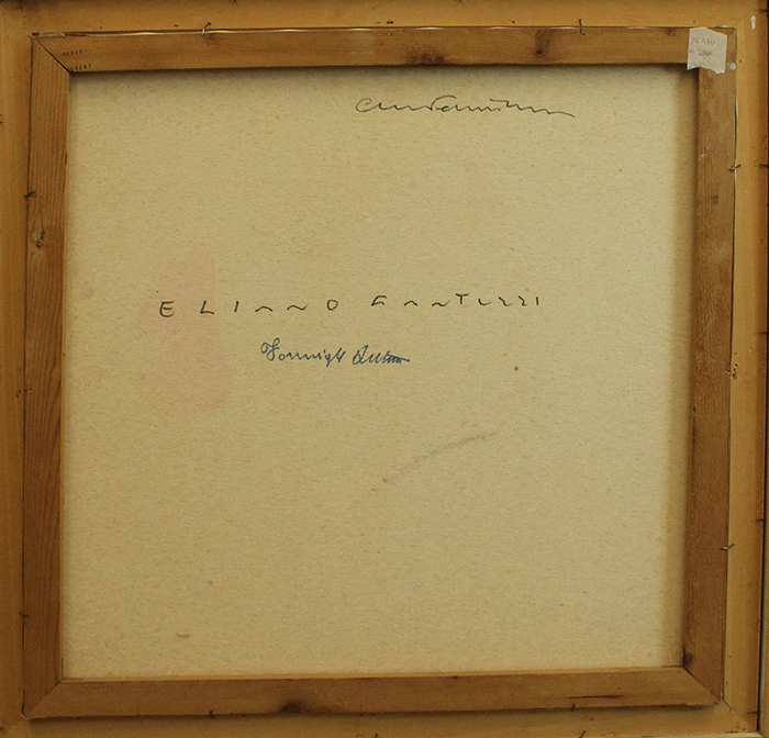 FANTUZZI ELIANO "Al bar" anni 70', olio su tela, cm 70x70 con cornice 94x94x3,5 kg 7 Al fronte: firma in basso a sinistra Al verso: firma nel centro e firma del suo mercante. Certificato di provenienza della Daliano Ribani Arte. Opera con cornice in omaggio.