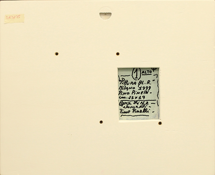 PINO PINELLI , 1999, tecnica mista , cm 27x19 con teca in plexiglass 40x48x10 kg 4. Al Verso informazioni dell'opera. Opera accompagnata da autentica e certificato di provenienza della galleria Daliano Ribani Arte