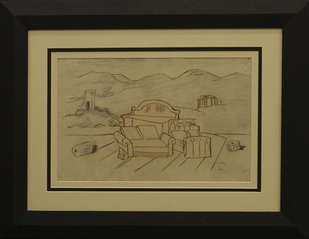 GIORGIO DE CHIRICO, "Mobili nella Valle", 1971, matita litografica su carta da lucido , cm 37,4x52,5 con cornice 60x78x2 kg 4. Opera accompagnata da autentica e certificato di provenienza della galleria Daliano Ribani Arte.