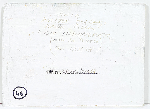 PIACESI EALTER, "Gli Innamorati", olio su tavola anno 2014, 13x18 cm, archiviata presso l'archivio Walter ,Piacesi rif. n° CPVVZ/03165, Titolo, anno , tecnica dimensioni e numero di archivio a retro. Autentica dell'artista su fotografia