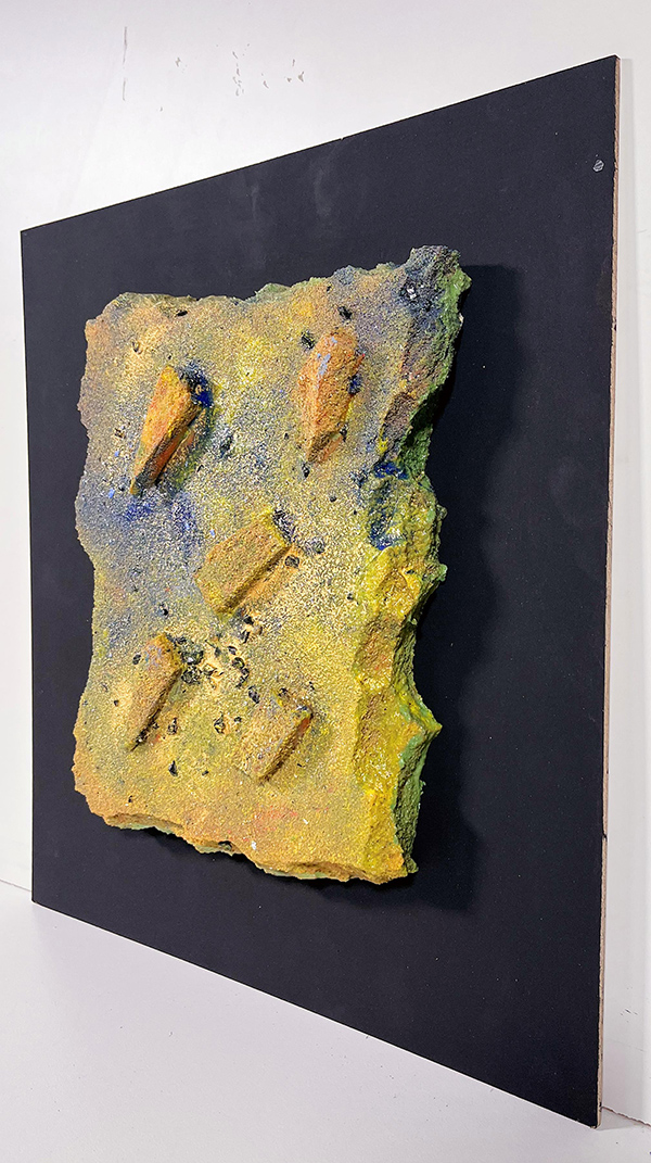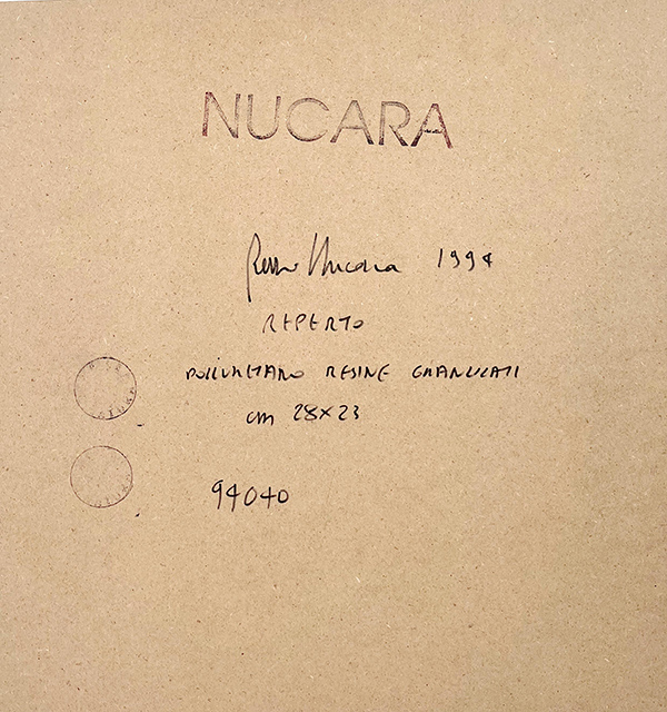 RENZO NUCARA, "Reperto", Poliuretano, pigmenti, granulati applicati su tavola, cm 23x28 (dimensione della tavola bianca cm 40x35). anno 1994, Firma, anno, timbro, titolo e numero d'archivio a retro, Opera archiviata col numero 94040. Autentica dell'artista su fotografia