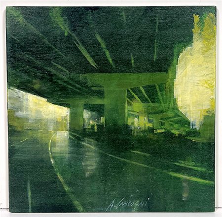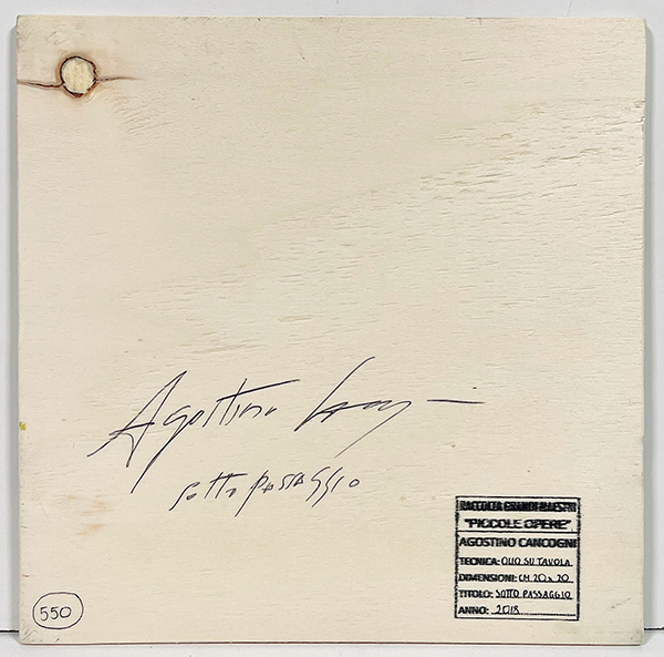 CANCOGNI AGOSTINO "Sotto Passaggio", olio su tavola anno 2018, firma e titolo a retro, autentica dell'artista su fotografia 20x20 cm