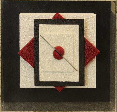 STEFANO SABA', "Tecnostruttura", 2009, tecnica mista con teca in plexiglass, cm 20x20x8, con teca cm 30x30x10, peso 1 kg. Al verso: misure e data. Opera protetta da teca in plexiglass.