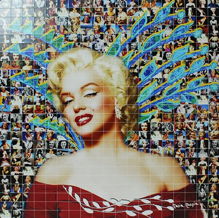 MARIA MURGIA, "Omaggio a Marilyn Monroe", 2022, fotomosaico digitale montato su pannello Kapafix cm 1 e intagliato a mano, cm 50x50, peso 1 kg. Opera con autentica su foto dell'artista. Al fronte: firma in basso a destra. Al verso: etichetta Certificato di autenticità con firma dell'artista.