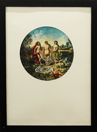 GIORGIO DE CHIRICO, "Le tre Grazie", ripreso dal dipinto del 1948, stampa dell'opera originale di Giorgio De Chirico del 1935 , tavola 18, dim 40x55 cm. Al verso: dettagli del quadro originale. Opera con cornice.