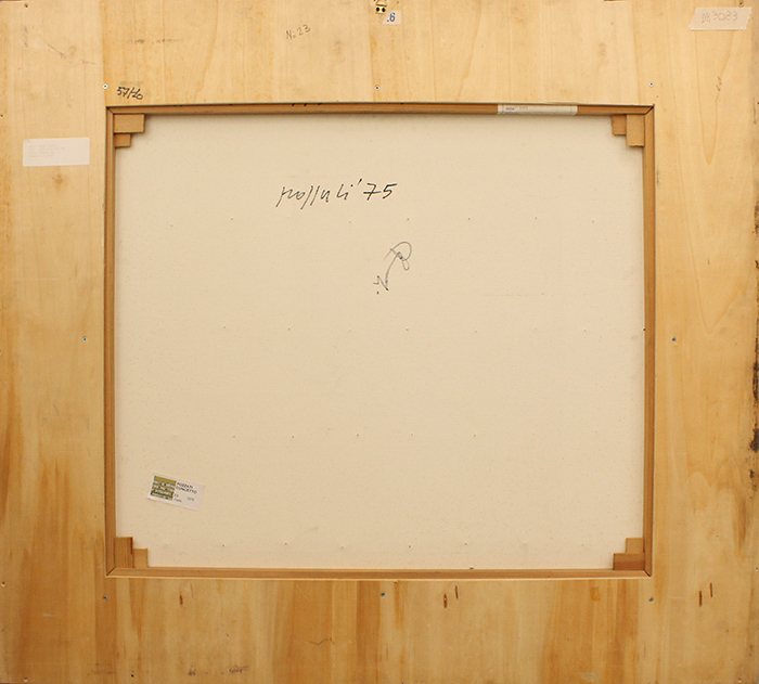 CONCETTO POZZATI, "Advertisement", 1975, tecnica mista su tela, cm 70x80x3, peso 4 kg, opera archiviata dall'Archivio Generale Concetto Pozzati, Gruppo G.A.M. Faenza Spa al N°1409/06. Pubblicato nel volume "Concetto Pozzati. Archivio generale", a cura di Gianluca Re, Christian Maeretti Editore, Faenza, 2006, vol I, p.66. Opera con certificato della Daliano Ribani Arte. Al verso: firma e anno al centro, in alto a sinistra etichetta con informazioni. Opera senza cornice. Presneta segni del tempo sul passpartout