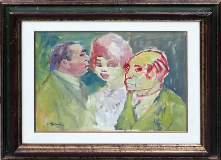 MINO MACCARI, "Personaggi", 1969, olio su tela, dim 35x45, opera archiviata dall'archivio delle opere di Mino Maccari a cura di Raymond John Charlton al numero 2849 in data 16/03/1976 Roma. Al fronte: firma e anno in basso a sinistra. Al verso: a sinistra etichetta "Galleria Il Castello": nome autore, titolo, anno, dimensioni, tecnica e timbro galleria.