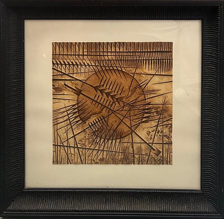 ARNALDO POMODORO, 1997, Calcografia su cartoncino, 30x30 cm. Al fronte: esemplare 38/200 in basso a sinistra scritto a mano, firma e anno in basso a destra scritta a mano. Opera con cornice