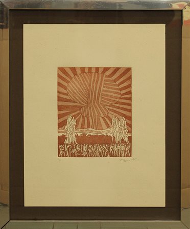 ANTONIO VANGELI, anni '80, incisione all'acquatinta su carta, esemplare IX/X, cm 40x30, cm 50x40x1, 1 kg. Al fronte: firma in basso a destra ed esemplare in basso a sinistra. Opera con certificato di provenienza della Daliano Ribani Arte. Opera con cornice.