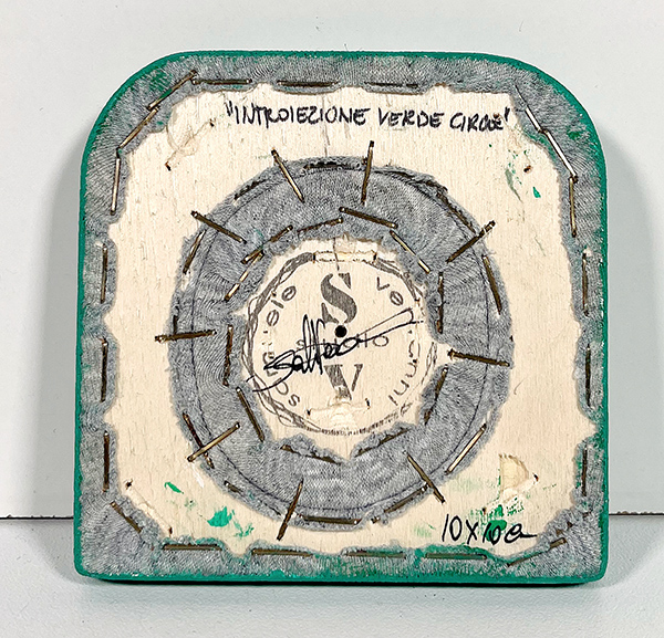 "Introiezione verde circle", acrilico su tela lavorata, 10x10 cm, titolo timbro e firma a retro