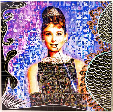 MURGIA MARIA, "Omaggio a Audrey Hepburn", fotomosaico digitale su pannelli kapafix dipinto e intagliato a mano, anno 2019, Archivio n°TGX.2646.RJ, 50x50 cm
