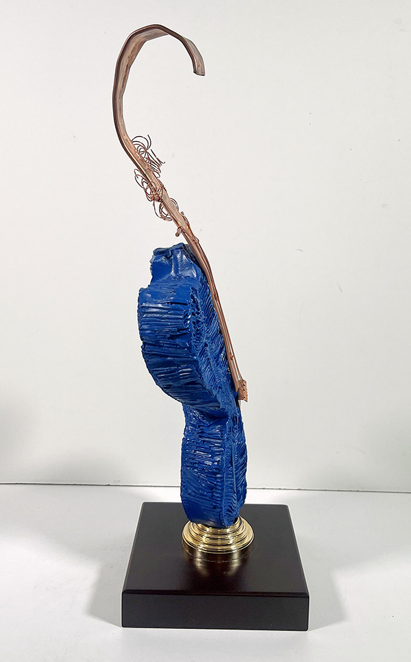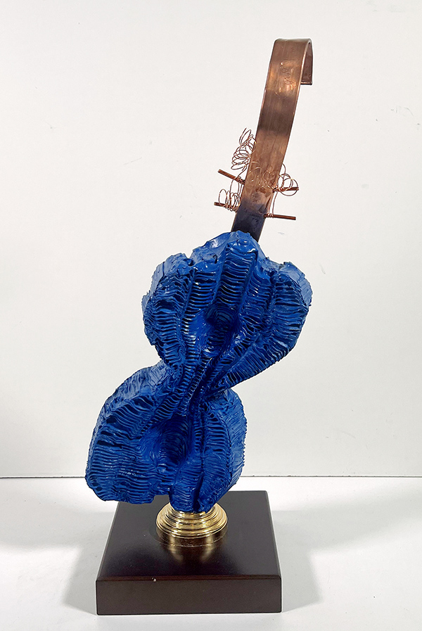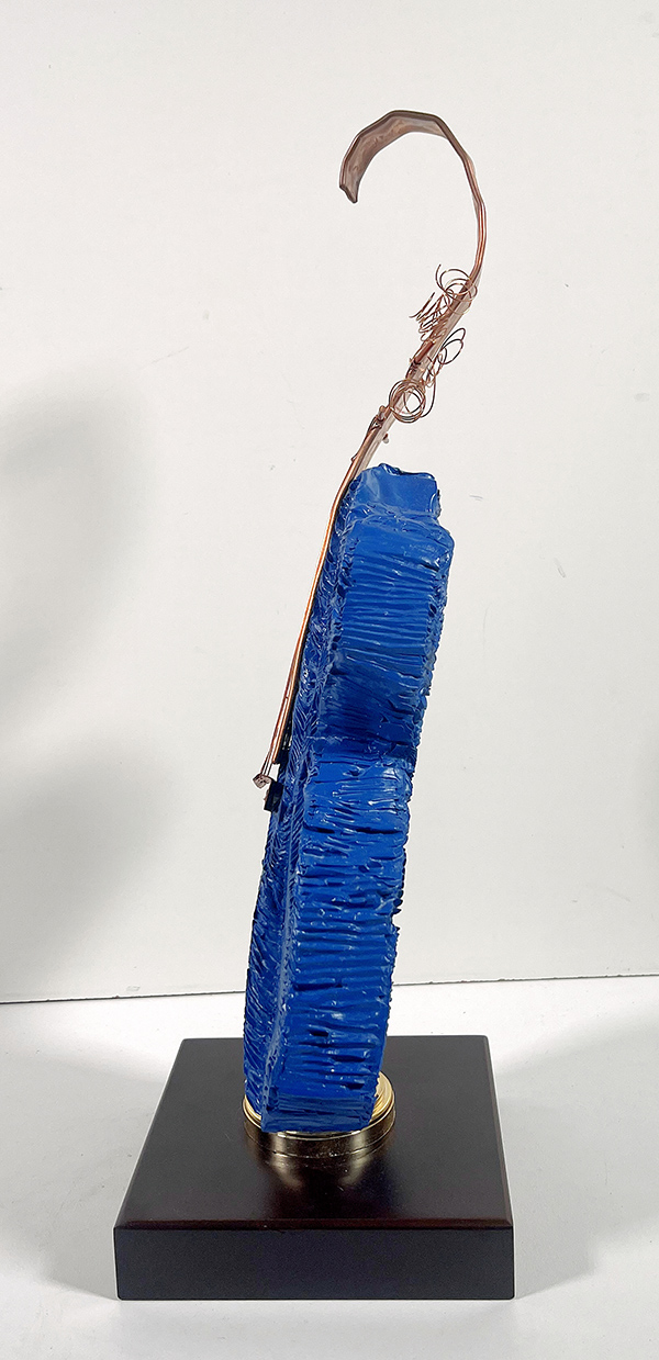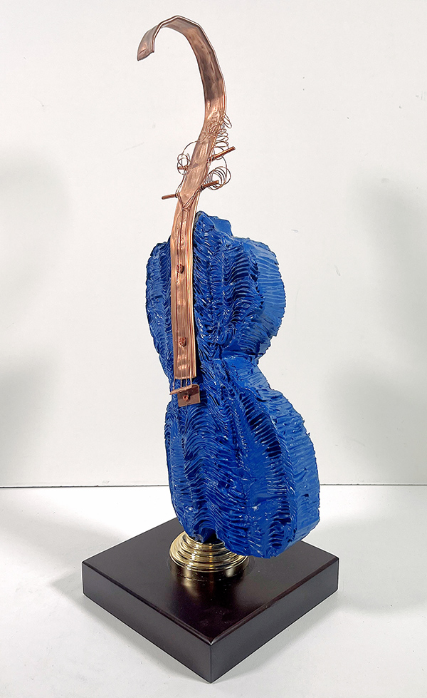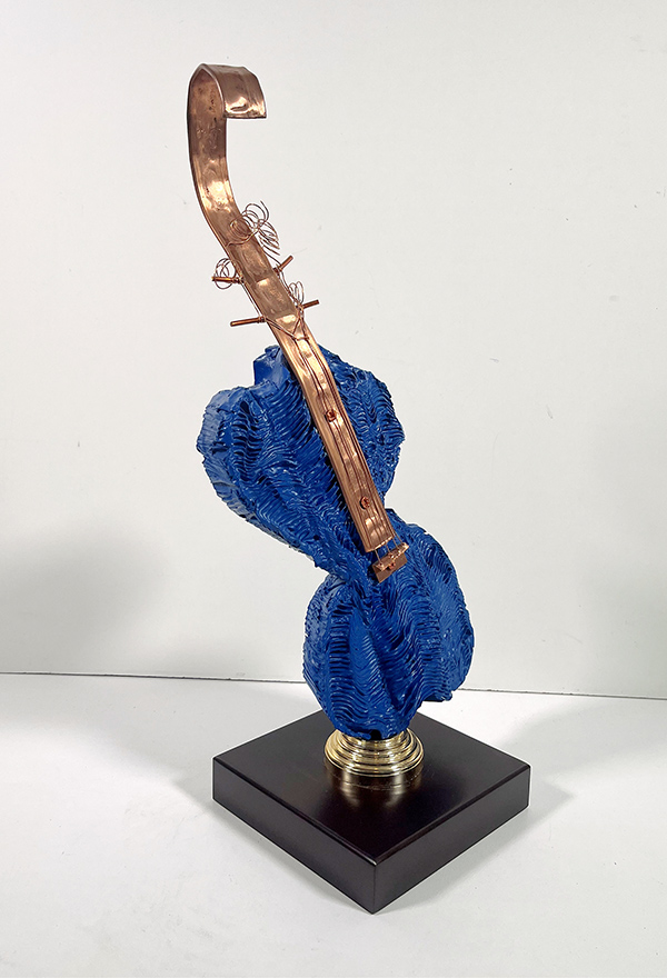 M'HORO', Multiplo: scultura in resina epossidica placcata in argento. L’artista ha realizzato e innestato, su ciascun violino, il manico in rame, le corde e il ponticello. Ogni esemplare è registrato nell’archivio ufficiale degli “original multiples”. Firma e numerazione incisa sul manico. Numerata a mano in alto e sotto la base. Tiratura 99 numeri arabi + 25 numeri romani + 15 P.d’A. Opera registrata presso l’archivio delle opere multiple di M’HORO’ come riportato sul certificato di autenticità. h43x16x15 cm