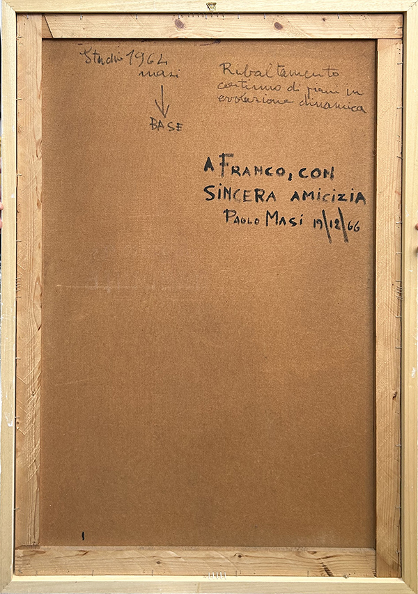 PAOLO MASI, "Ribaltamento continuo di piani in evoluzione dinamica", 1964, olio su faesite, cm 107x73. Al verso: "Studio 1964", titolo, dedica ad personam "A Franco". Opera accompagnata da autentica su foto dell'artista. Opera con cornice.