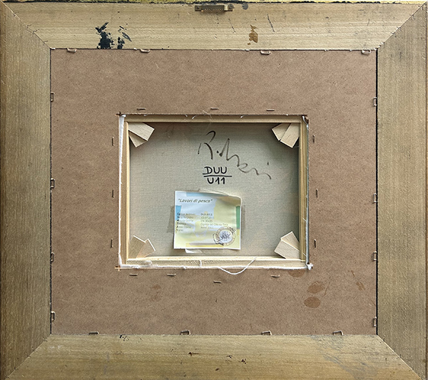 ROBERTO MASI, "Lavori di pesca", 2011, olio su tela, cm 30x35. Al fronte: firma in basso a sinistra. Al verso: firma e etichetta con informazioni. Opera archiviata al n° DUUU11. Opera con cornice