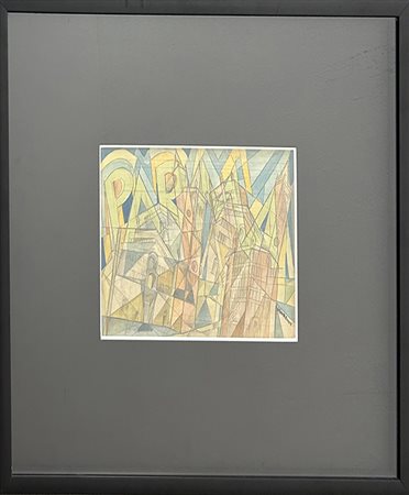 UBERTO BONETTI, "Parma", anni '30, acquerello e tecnica mista su carta, cm 20x30, con cornice 63x53. Al fronte: firma in basso a destra. Opera pubblicata nel Catalogo "Anni '30, l'Italia nelle aeroviste". Opera con cornice