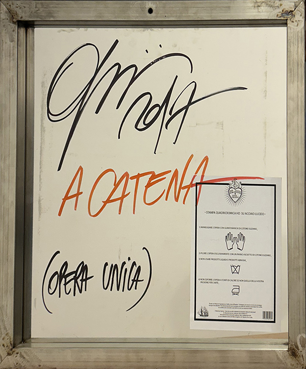 PEP MARCHEGIANI, "A catena", 2017, stampa quadricromica su acciaio mirror, cm 50x50. Al verso: titolo, anno, firma, "opera unica". Opera custodita in teca di legno