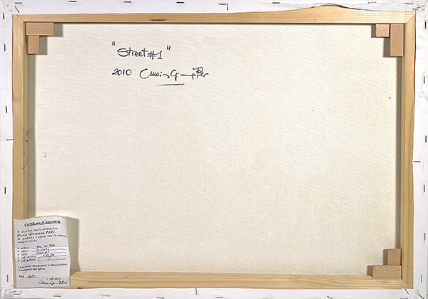 PERI MARIA GIOVANNA,"Street°#1", olio su tela anno 2012, cod. archivio 0384/or, titolo anno firma e certificato di autenticità a retro, autentica dell'artista su fotografia. cm 50x70