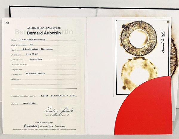 AUBERTIN BERNARD, "Livre Brulé Rosenberg", fiammiferi su catalogo, opera registrata presso l' Archivio Generale Berbard Aubertin galleria Rosenberg Milano.Certificato di archiviazione su fotografia