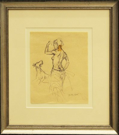 ALBERTO SUGHI, 1982 circa, "Donna con cane", penna ad inchiostro su carta, cm 18x14,5 con cornice in omaggio cm 34x31x2 kg 1. Al fronte: firma in basso a destra. Opera archiviata dell'archivio Sughi a Forlì il 18 Aprile 2019, al numero AS1o93o. Opera con certificato di provenienza della galleria Daliano Ribani arte.
