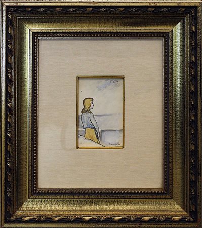ORFEO TAMBURI, "Ragazza che osserva l'orizzonte" anno 1970, acquerello su cartoncino, cm 14x9 con cornice in omaggio 44x39x6 kg 3. Al fronte: firma in basso a destra, anno in alto a destra. Certificato di provenienza della Daliano Ribani Arte. Opera con cornice in omaggio.