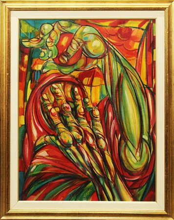 GIANBAR, "Carnevale di Ivrea", 1973, olio su tela intavolata, dim 70,5x53. Al fronte: firma al centro in basso. Al verso: timbro Galleria Accademia Torino nel centro ed etichetta galleria Accademia in basso a destra con informazioni. Opera con cornice.