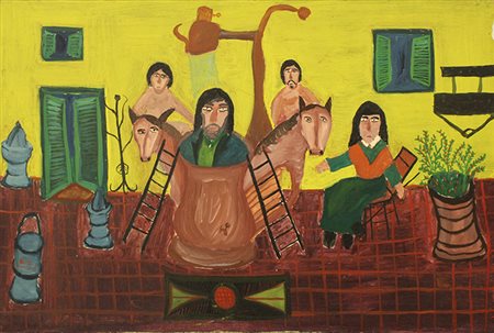 NINO CAMARDO "Scena" anni 70', olio su tela cm 40x60 1 kg 0,50. Al verso : firma in basso a sinistra. Certificato di provenienza della Daliano Ribani Arte.
